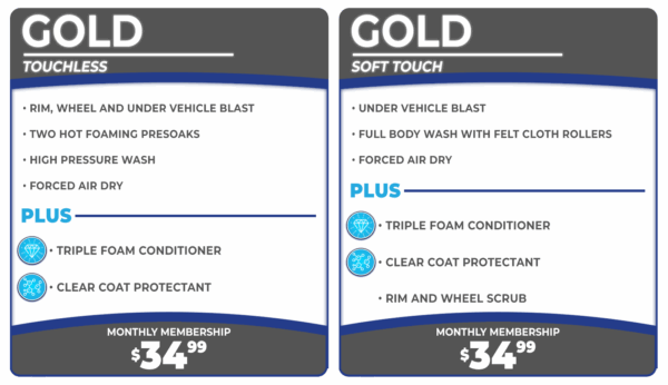 Keep your vehicle spotless and protected with our Gold Membership, offering unlimited washes in either the Touchless or Soft Touch lanes. Each wash features Triple Foam Conditioner, Clear Coat Protectant, rim and wheel scrub, under vehicle blast, two hot foaming presoaks, high-pressure wash, a soft wash with felt cloth rollers, and a forced air dry. This membership is perfect for those who want a consistently clean car and the convenience of choosing their wash type every time.
